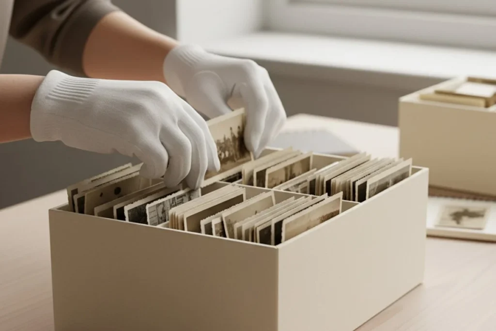 Use archival-quality storage materials exclusively. Regular paper, cardboard, and plastic contain acids and chemicals that damage prints through direct contact.